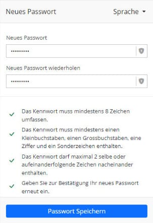 - Geben Sie Ihr eigenes Passwort ein. Unsere Seite hilft Ihnen dabei, ein sicheres Passwort zu wählen. Daher kann das Passwort erst gespeichert werden, wenn alle Anforderungen erfüllt sind. Speichern Sie das Passwort nun.