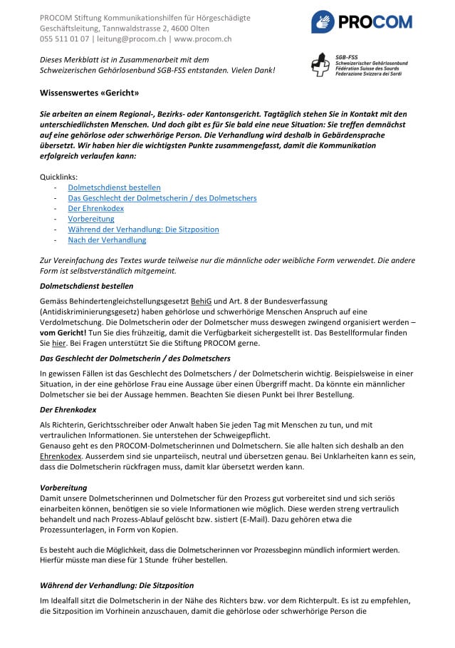 Als Richter, Anwältin oder Justizangestellte sind Sie tagtäglich mit verschiedenen Menschen im Dialog. Befragungen und Verhandlungen werden in zahlreiche Sprachen übersetzt – auch in Gebärdensprache. Weil die Gebärdensprache eine visuelle Sprache ist, gibt es einige spezielle Punkte zu beachten. Erfahren Sie mehr hier:
