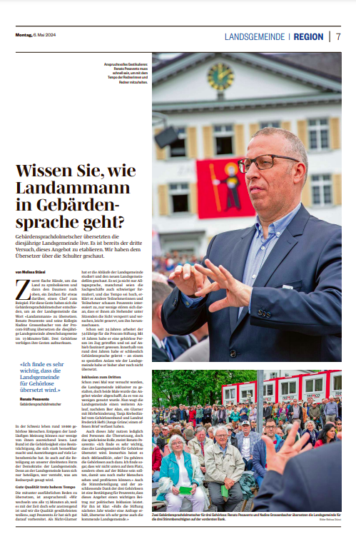 Les interprètes de PROCOM, Renato Pesavento et Nadine Grossenbacher, ont interprété en direct lors de la Landsgemeinde de cette année afin de permettre aux personnes sourdes de participer à ce débat important. Il s’agit d’une étape importante pour l’inclusion et la démocratie. Accompagnez-nous dans les coulisses de cette mission particulière !