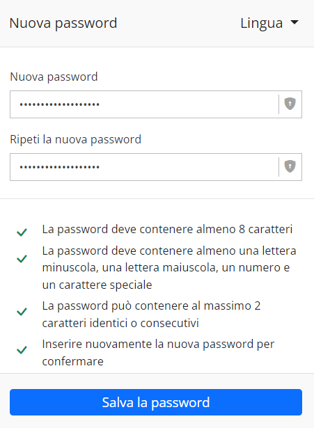 - Inserite la vostra password. Il nostro sito vi aiuterà a scegliere una password sicura. Pertanto, la password può essere salvata solo dopo aver soddisfatto tutti i requisiti. Salvate la password.